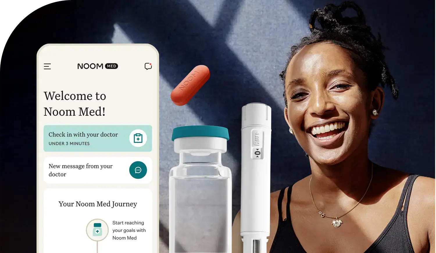 woman smiling with a noom vial, orange pill, and the noom app </p>
